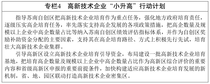 (一)實(shí)施創(chuàng )新型園區建設行動(dòng)計劃。突出高新區科技創(chuàng )新主陣地作用,省市協(xié)同推動(dòng)高端資源優(yōu)先向高新區集聚、高端項目?jì)?yōu)先在高新區落戶(hù)、高端人才優(yōu)先為高新區服務(wù),統籌布局建設一批一流高科技園區、創(chuàng )新型科技園區和創(chuàng )新型特色園區。加快建設蘇州獨墅湖科教創(chuàng )新區、蘇州科技城、南京高新區研創(chuàng )園、南京麒麟科技城、無(wú)錫太湖國際科技園、常州科教城、江陰濱江科技城、宜興環(huán)科園、鎮江團山睿谷等,打造一批集知識創(chuàng )造、技術(shù)創(chuàng )新和新興產(chǎn)業(yè)培育為一體的創(chuàng )新核心區。發(fā)揮高新區引領(lǐng)示范和輻射帶動(dòng)作用,鼓勵高新區通過(guò)一區多園、南北共建、異地孵化、飛地經(jīng)濟等方式,加強區域間資源統籌、創(chuàng )新合作與產(chǎn)業(yè)配套,大力推動(dòng)“產(chǎn)業(yè)轉移+技術(shù)轉移”,進(jìn)一步拓展發(fā)展空間??偨Y和推廣蘇州工業(yè)園區管理標準,完善高新區考核評價(jià)制度和指標體系,重點(diǎn)突出特色產(chǎn)業(yè)創(chuàng )新集群培育、畝均產(chǎn)出水平、高新技術(shù)企業(yè)培育等內容,引導高新區更大力度推進(jìn)創(chuàng )新發(fā)展。到2022年,蘇南自創(chuàng )區內進(jìn)入世界一流高科技園區、國家創(chuàng )新型科技園區和創(chuàng )新型特色園區的高新區達11家。